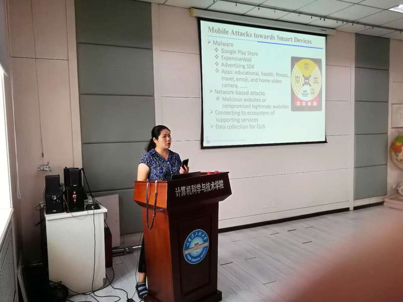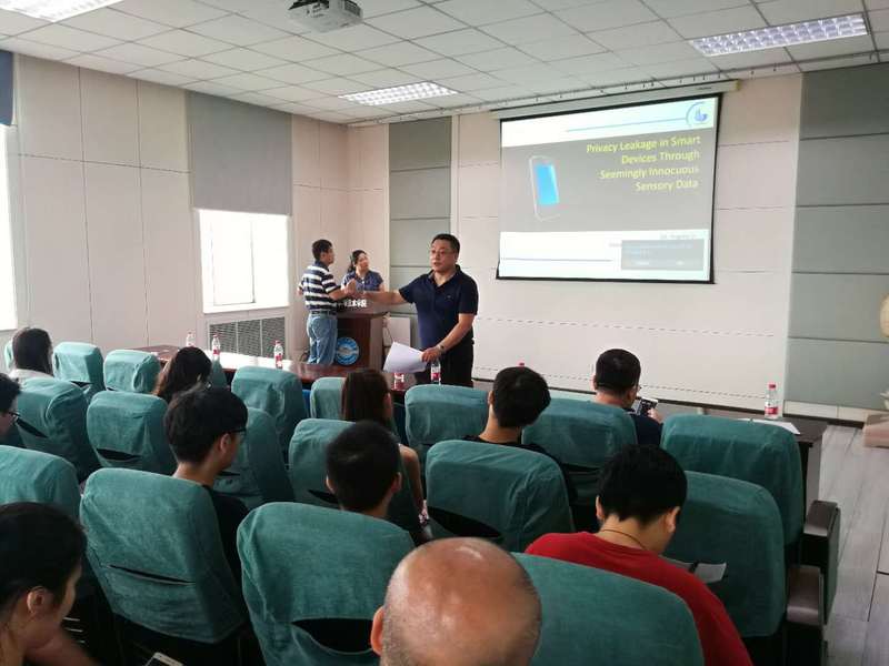首先,科研副院长韩启龙教授向与会人员介绍李教授简历,针对学院与佐治亚州立大学在学生培养、科学研究等方面开展的合作进行了回顾和展望,并就交流内容向与会人员进行了提醒,要求双方交流要紧密围绕学术、科研开展。李教授结合其实验室目前的研究内容展开讲解,从数据隐私保护的重要性、研究背景、研究方案等方面详细的说明了当前移动设备安全保护方面的漏洞和急需解决的问题。报告环节之后,李教授同与会人员开展互动交流,与会教师同学踊跃提问,李教授均一一耐心回答,本次学术报告使我院师生及时了解到国际最新研究动态,对开展科研工作起到积极的促进作用。