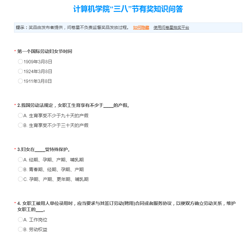 有奖知识问答(线上)活动以手机问卷星答题链接形式开展,学院共有56名女教工全部参加该项活动,答题平均分数高达83.04,学院精心为每一位参与女教工发放活动纪念品一份。
