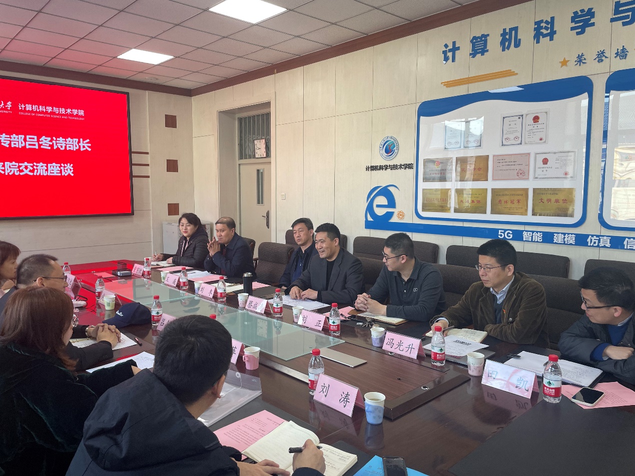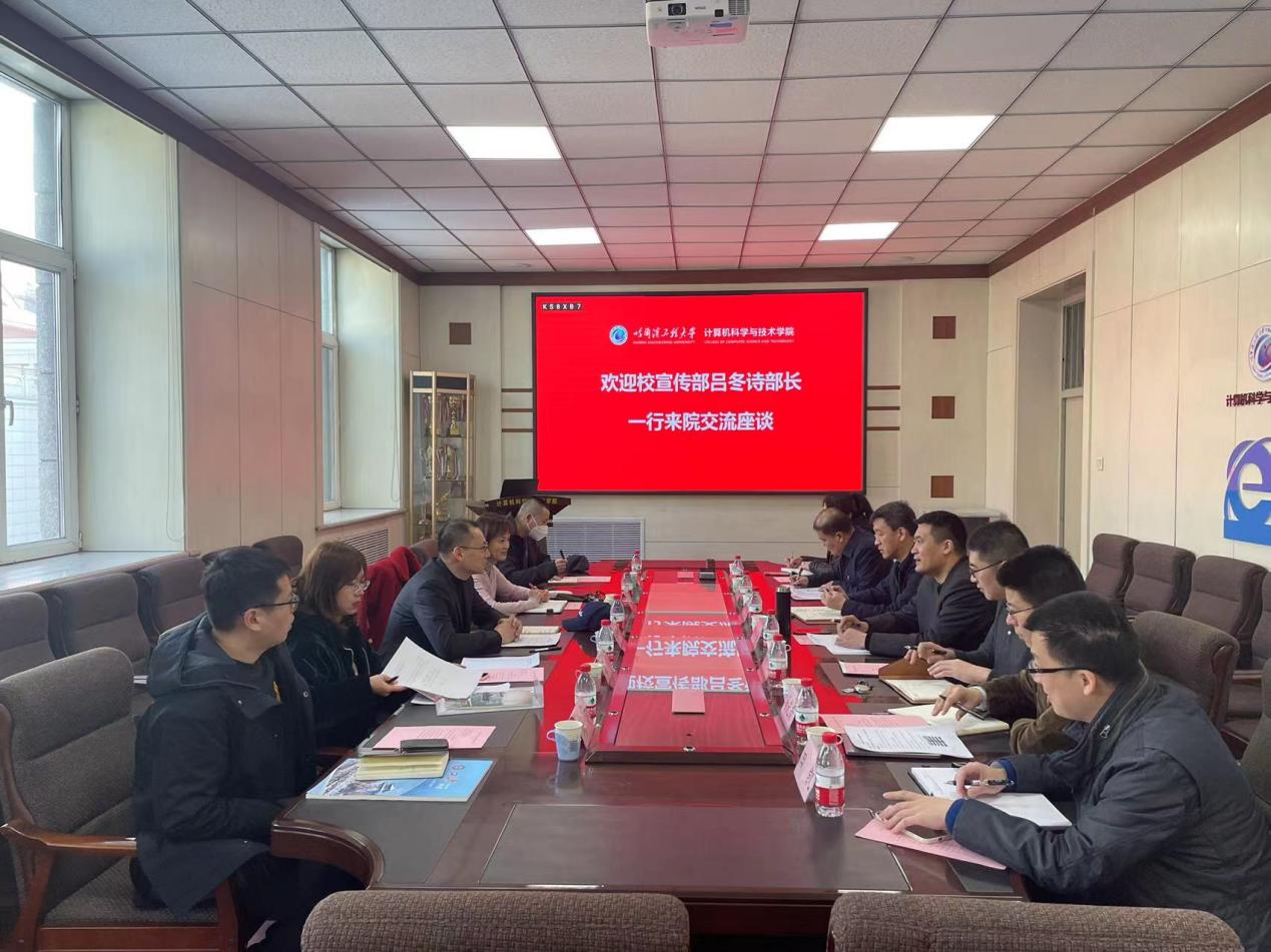 3月8日上午,校党委常委、宣传部部长兼统战部部长吕冬诗、宣传部副部长兼新闻中心主任金声一行到pp电子游戏官网听取宣传工作汇报并做交流。学院院长蔡成涛主持会议,党委书记刘冬,党委副书记刘正,副院长王巍、冯光升、田凯、董宇欣参加会议并就学院宣传工作进行汇报。