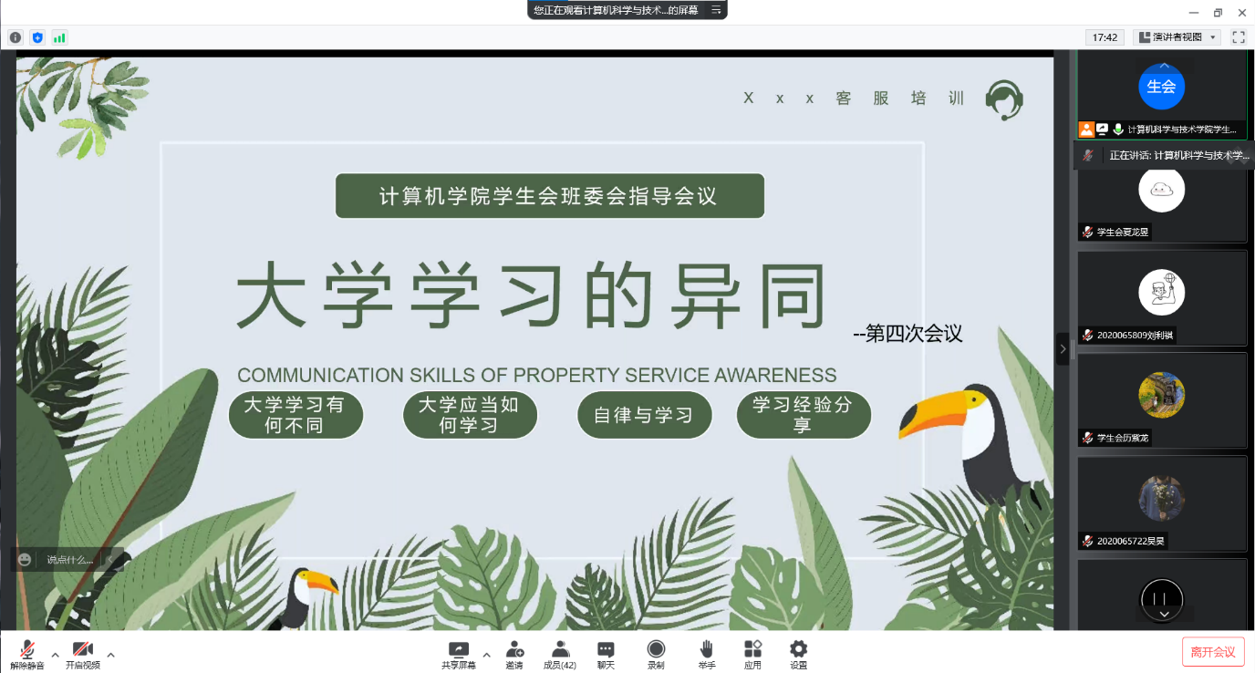 本次会议的主题是“大学学习的异同”。程相清对于大学学习与高中学习的区别、大学生应当如何学习、如何自律学习几点进行了详细讲解,最后分享了自己的学习经验,之后学生会主席张人杰分享了自己调动班级学习氛围的经验。
