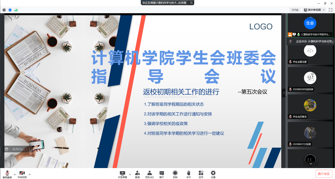 本次会议的主题是对返校初期相关工作的安排与解读,主持人会上了解了班级同学返校后的状态,对本学期相关工作进行安排和通知,强调了学校的相关防疫政策,对班级同学本学期的学习进行一些经验分享。
