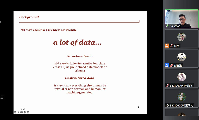 2022年6月14日,pp电子游戏官网举行2022年第三期(总第七期)智汇论坛。本次活动邀请普华永道澳大利亚首席数据科学家和高级经理Kai Zhan,以“机器学习在咨询审计领域的应用”为题作专题讲座。