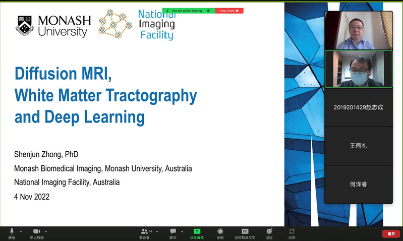 2022年11月4日,pp电子游戏官网举行了智汇论坛2022年第六期(总第十期)活动。本次活动邀请澳大利亚莫纳什大学医学影像中心研究员,澳大利亚国家影像中心研究员钟申俊以“脑部白质纤维束成像技术和深度学习的应用 ”为题作专题讲座。