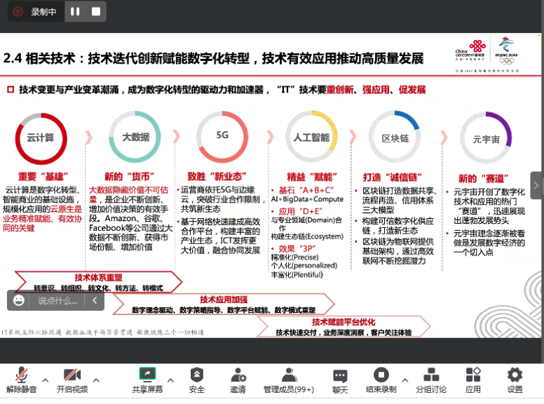 杨宝秋总监报告题目为“数字经济与企业数字化转型”的报告,本次报告以数字经济知识为切入,以中国联通为样例,多维度地介绍了企业数字化转型的背景、现状以及必要性。以点带面地介绍了十四五规划以及云计算、大数据、AI等前沿科学知识。最后,阐述了在数字化转型中企业对于人才的具体需求。