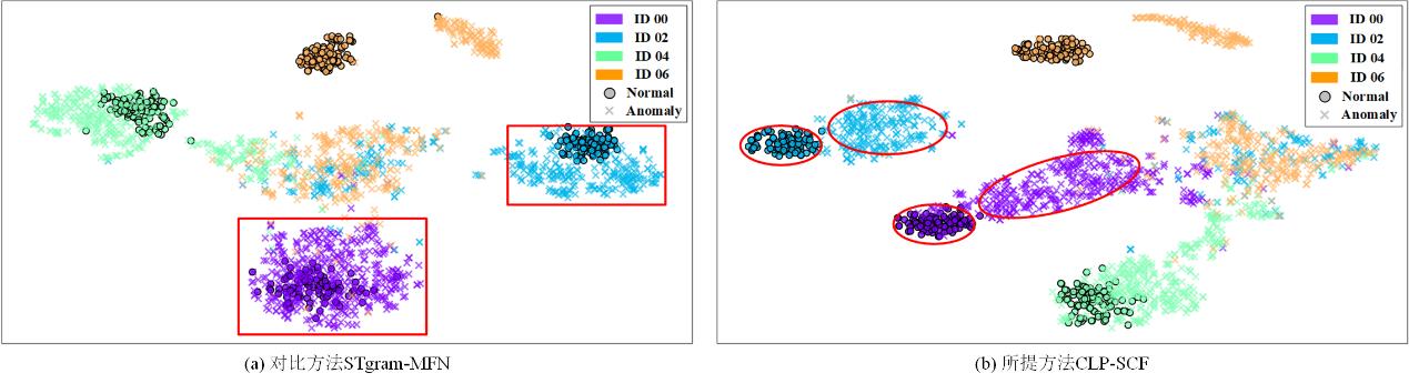 图2 基于机器ID的音频表示与对比学习预训练的异常声音检测T-SNE对比示例图