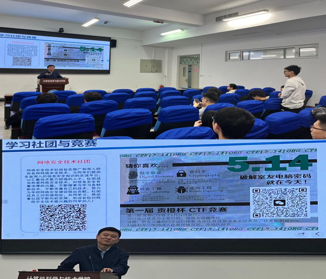 2023年5月5日下午18:40,pp电子游戏官网苘大鹏教授为信息安全专业进行宣讲,从信息安全重要意义、专业简介、人才培养体系再到社会就业前景都做了全面介绍。针对学生问题对专业前景和毕业去向做了详尽的分析,针对学生政策性的问题也做出了逐一解答。有兴趣的同学可以参加网络安全技术社团。