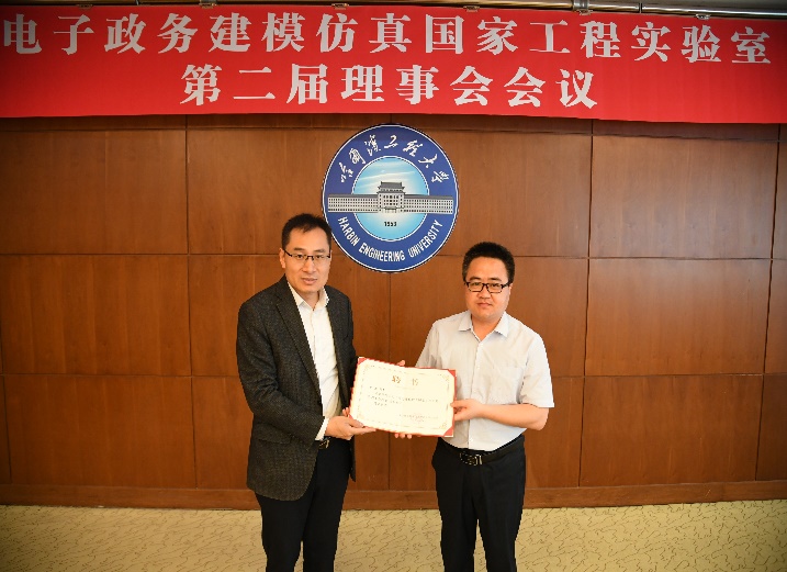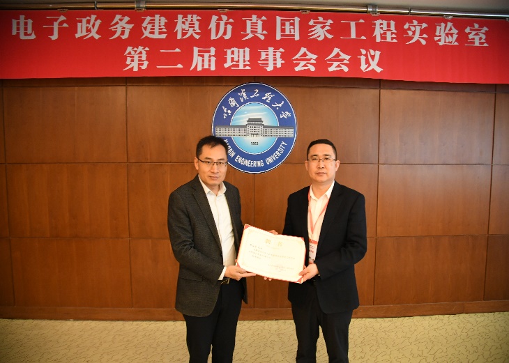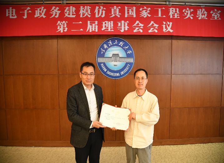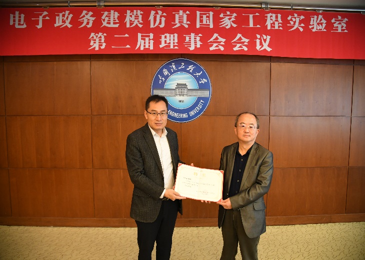 首先,实验室副主任王巍宣读电子政务建模仿真国家工程实验室理事会任命文件。电子政务建模仿真国家工程实验室理事成员由姚郁、於志文、蔡成涛、仲恺、江源富、刘燕、杨凤春、赵海涛、孟庆国、党毅共10人组成,姚郁当选为第二届理事会理事长,於志文当选为常务副理事长,孟庆国、仲恺、蔡成涛当选为副理事长。