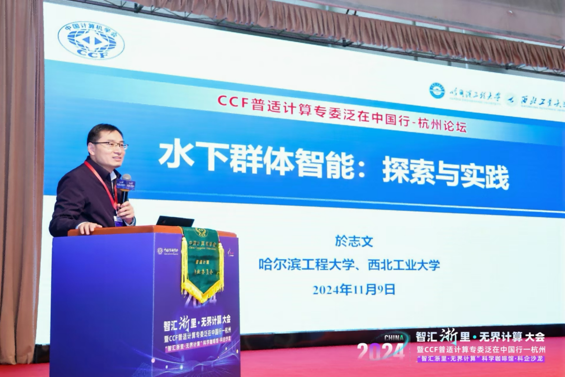 随后,於志文教授受邀作了题为“水下群体智能:探索与实践”的专家报告,系统介绍了群体智能及水下群体智能的内涵、应用场景和面临的挑战,并总结了团队在该领域的主要研究方向及探索成果。