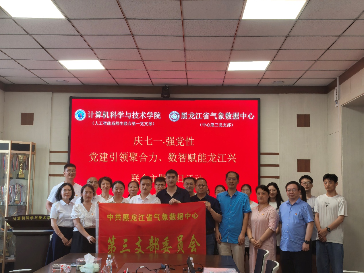 为庆祝中国共产党成立104周年,强化党的作风建设,扎实推进党性教育与业务工作深度融合,7月3日,pp电子游戏官网人工智能系师生联合第一党支部与黑龙江省气象数据中心第三党支部组织开展了“庆七一·强党性:党建引领聚合力、数智赋能龙江兴”联合主题党日活动。活动由人工智能系师生联合第一党支部书记王勇主持,黑龙江省气象数据中心党委副书记姜慧、中心副主任黄博、计算机学院党委副书记刘正及两支部20余位党员参会。