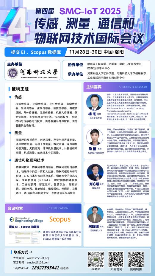 SMC-IoT 2025旨在促进传感、测量、通信和物联网技术等领域的专家学者交流与合作,热忱地欢迎从事相关技术研究的专家、学者和专业技术人员踊跃参加大会。